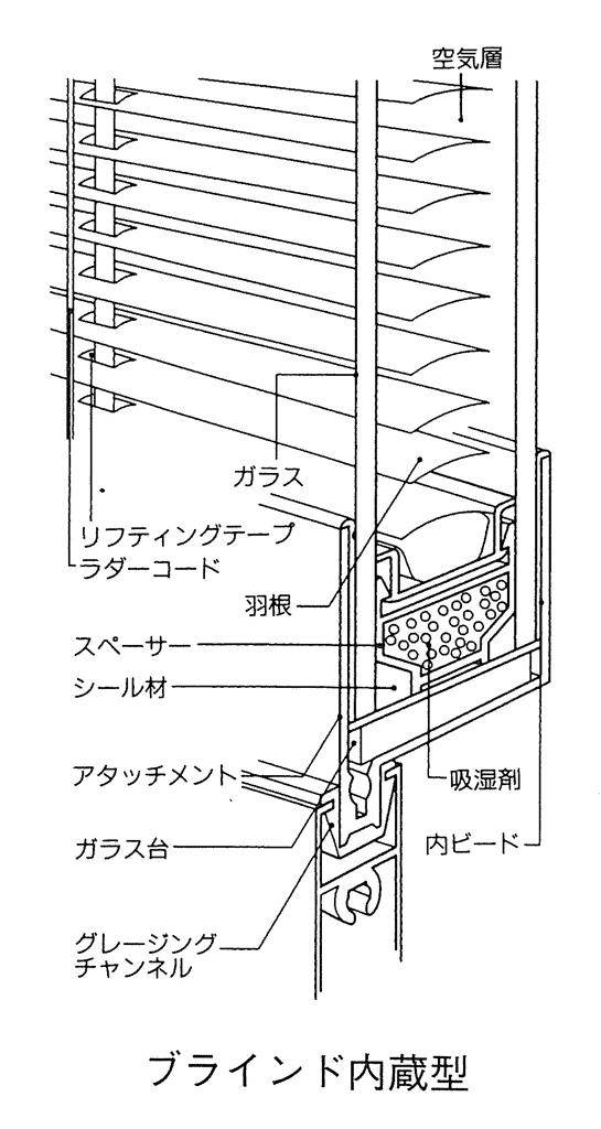ガラスとガラスの間にベネシャンブラインドを組み込み、室内側からハンドルやコードで操作できるもの。断熱性、防音性を高め、採光・視線調節ができます。