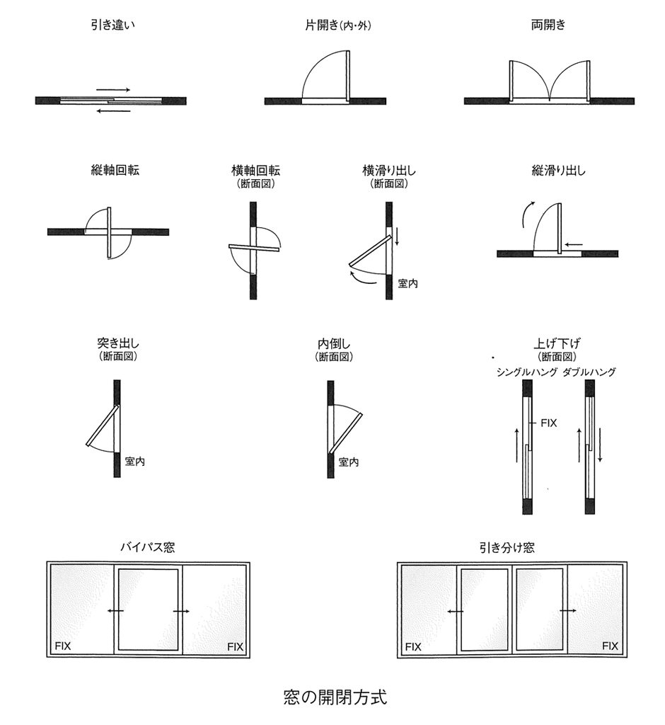上下に動く窓。上部をはめ殺しにしたタイプ(シングルハング)、上下とも自由に動くタイプ(ダブルハング)、バランサーという金具を用いることでひとつの操作で上下が釣り合って動くタイプ(バランス上げ下げ窓)があります。