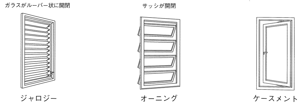 一般に多段の滑り出し窓を指し(一段のものもある)、ハンドル操作で開閉します。ジャロジーに形態は似てますが、気密性の面で優れます。網戸は内付け。