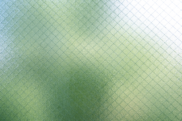 成形の際、ガラス板の間に金網を入れたもので、クロスワイヤ(水平・垂直)と菱クロス(45°に傾斜)の2つのパターンがあります。火災などの加熱で割れた時に飛び散らないので、建築基準法にて防火設備(防火戸)用のガラスに指定されています。ただし、防犯効果はありません。